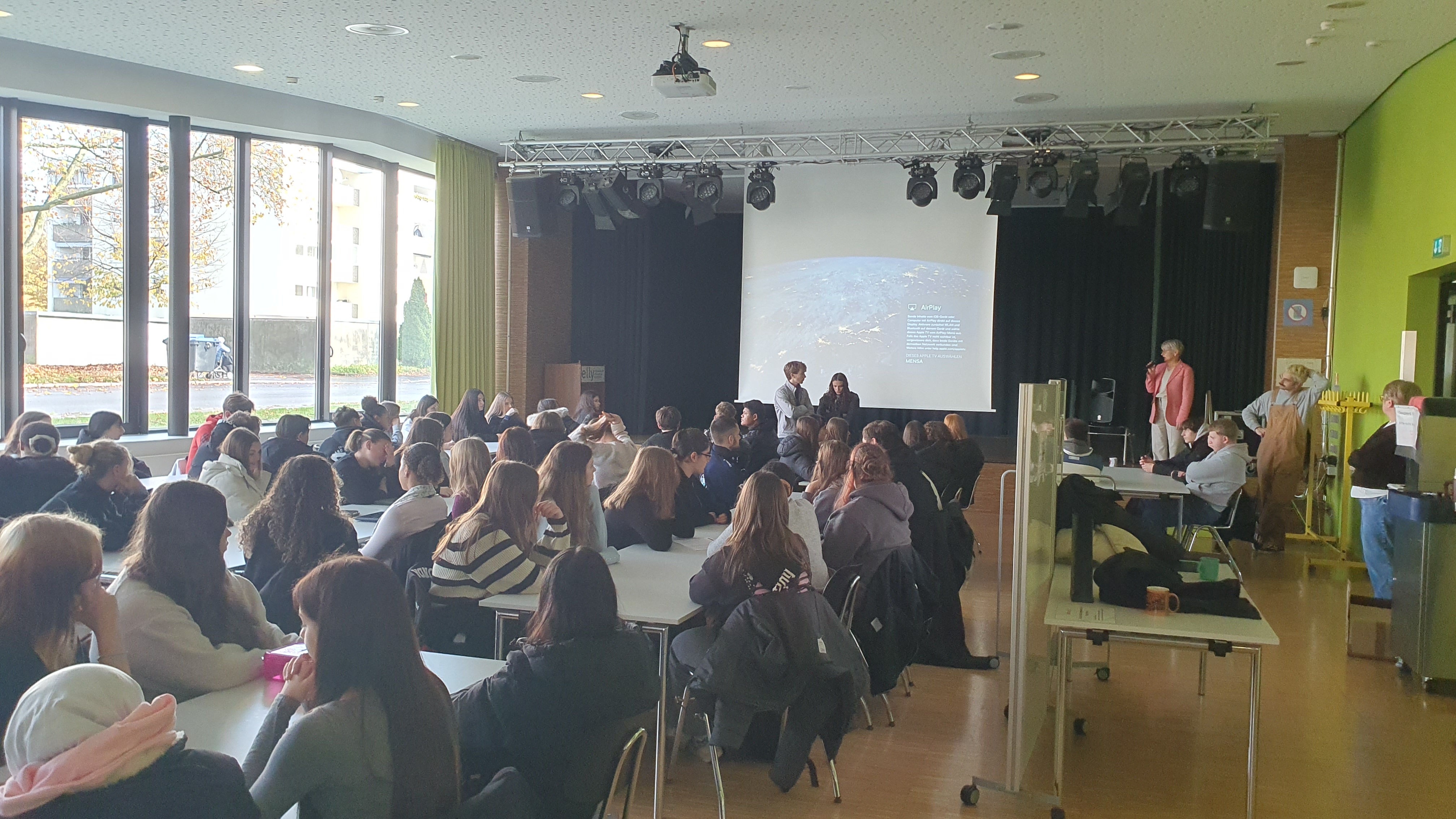 Am Montag, den 10. November 2025, fand in der 3. und 4. Schulstunde eine informative und kurzweilige Schulversammlung für die Klassenstufen 9 und 10 statt. Die Mensa des Elly-Schulcampus bot den passenden Rahmen für die Veranstaltung, die von Schulleiterin Frau Piontek eröffnet wurde.
